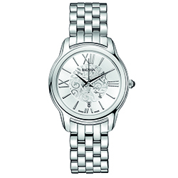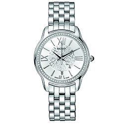 Стальной корпус с безелем, инкрустированным 68 бриллиантами общим весом 2,26 карат; серебристый циферблат, с декором в виде арабесок, с белыми римскими цифрами (III, VI, IX, XII) и условными индексами, с гранёными центральными стрелками часов и минут, центральной секундной стрелкой; стальной наборный браслет.