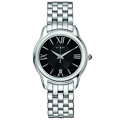 Стальной корпус с безелем, украшенным 68 бриллиантами общим весом 2,26 карат; белый перламутровый циферблат с римскими цифрами (III, VI, IX, XII) и условными индексами белого цвета, с гранёными центральными стрелками часов и минут, центральной секундной стрелкой; стальной наборный браслет.