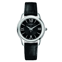 Стальной корпус; чёрный с гильошированием циферблат с белыми римскими цифрами (III, VI, IX, XII) и условными индексами, с серебристыми гранёными центральными стрелками часов и минут, серебристой центральной секундной стрелкой; чёрный ремешок из натуральной кожи.