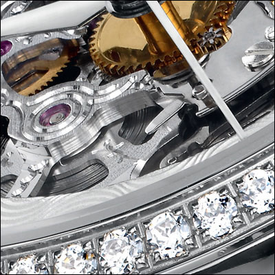 Прозрачная задняя крышка и сквозная центральная часть циферблата позволяют рассмотреть все нюансы движения колёс механизма и красоту ажурных мостов, украшенных гравировкой в изысканном стиле «Людовик XIV».