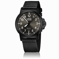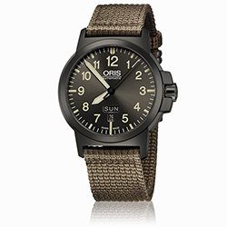 10. Oris Aviation BC 3 Advanced Day Date 01 735 7641 4263-07 5 22 22G Многокомпонентный корпус из нержавеющей стали с PVD-покрытием цвета серой оружейной стали. Тёмно-серый циферблат с арабскими цифрами одинаковой величины, условными часовыми индексами и стрелками, покрытыми люминесцентным составом «Superluminova» цвета «old radium». Тёмно-бежевый текстильный ремешок с застёжкой из нержавеющей стали с PVD-покрытием серого цвета. |