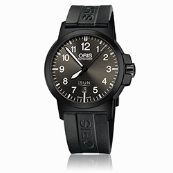 11. Oris Aviation BC 3 Advanced Day Date 01 735 7641 4263-07 4 22 05G Многокомпонентный корпус из нержавеющей стали с PVD-покрытием цвета серой оружейной стали. Тёмно-серый циферблат с арабскими цифрами одинаковой величины, условными часовыми индексами и стрелками, покрытыми люминесцентным составом «Superluminova» цвета «old radium». Чёрный каучуковый ремешок с застёжкой из нержавеющей стали с PVD-покрытием серого цвета. |
