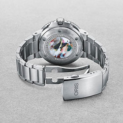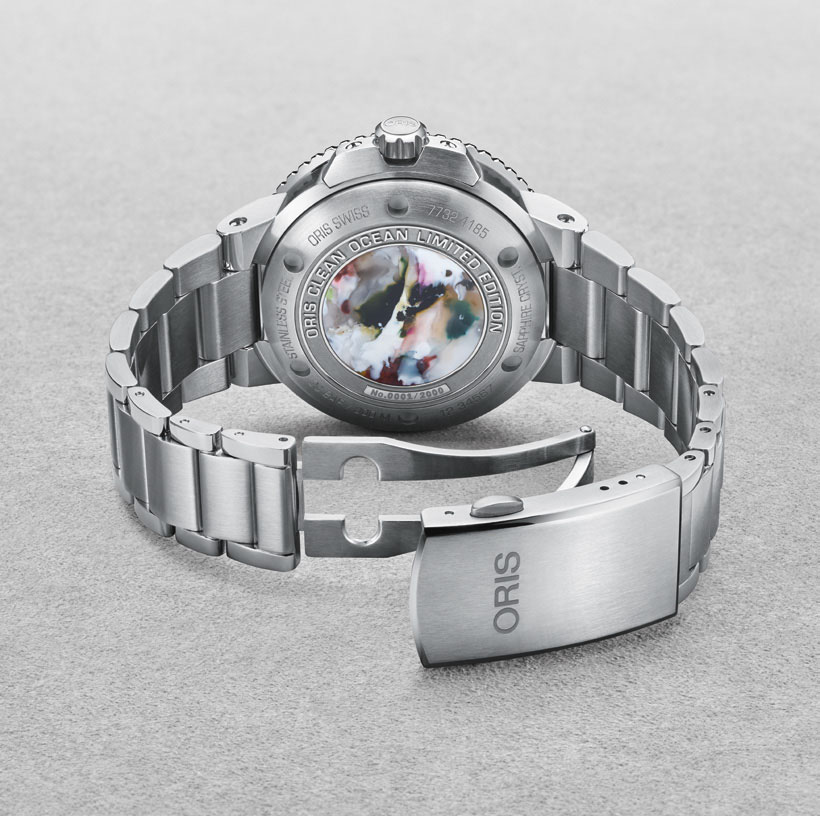 Часы ограниченной серии Oris Clean Ocean созданы на базе дайверских часов Oris Aquis и включают медальон на задней крышке часов, изготовленный из переработанного полиэтилентерефталата.
