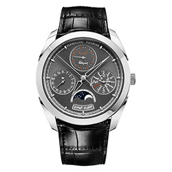 Модель Hijri Perpetual Calendar выполнена в платиновом корпусе диаметром 44,5 мм с грифельным циферблатом и платиновым ротором автоподзавода. Она показывает часы и минуты, а также дату индо-арабскими цифрами, название и продолжительность месяца на арабском языке, а также обычные и високосные годы. Кроме того, здесь имеются указатели лунных фаз с диском из авантюрина и 48-часового запаса хода. Как у всех часов Parmigiani Fleurier все без исключения детали механизма, включая скрытые от глаз, декорированы вручную специалистами мануфактуры.
