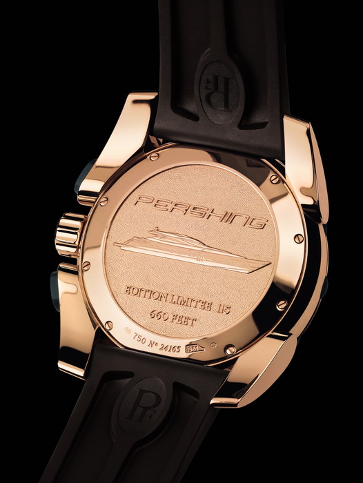 Они представляют собой ограниченную серию часов, ставших первым результатом нового сотрудничества двух компаний и выпущенных в честь самой большой и роскошной 38-метровой яхты «Pershing», изображение которой выгравировано на задних крышках корпусов часов.