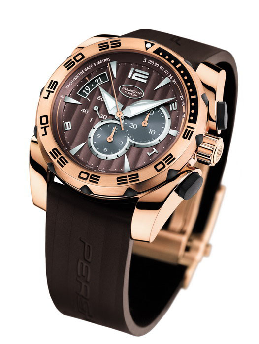 Тахометры для подводных погружений ещё один замечательный продукт компании «Parmigiani Fleurier». Обычные тахометры представляют собой специальные приборы, с помощью которых можно измерить среднюю скорость автомобиля на значительном расстоянии – до 1000 метров. Тахометры хронографов «Pershing» созданы для работы на глубине и способны измерять скорость подъема подводных пловцов на расстоянии трёх метров. Известно, что безопасная скорость подъёма с глубины должна составлять от шести до восемнадцати метров в минуту. Для безопасного подъёма достаточно замерить 3-метровое расстояние, установить в исходное положение секундную стрелку хронографа и запустить её. Затем, через три метра, остановить стрелку и она укажет точное значение скорости подъема.