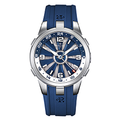 Спортивный и современный характер часов подчеркивает выбор материала: крупный корпус диаметром 44 мм изготовлен из стали. Сапфировое стекло защищает знаковый элемент коллекции Turbine – знаменитую турбину на циферблате, на который нанесены накладные арабские цифры и часовые метки. Трехмерный эффект создает ощущение погружения в самое сердце модели. Лопасти синего или черного цвета из анодированного алюминия, вращаясь в такт движению руки, открывают взору нижний циферблат с узором Côtes de Genève и изящной гравировкой в виде карты мира.