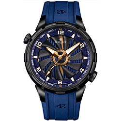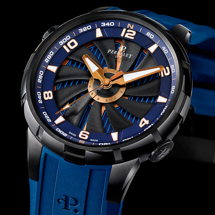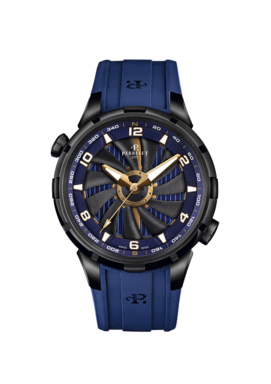 Корпус из матовой нержавеющей стали марки «316L» с чёрным PVD-покрытием; неподвижный безель с декоративными каннелюрами и четырьмя зажимами. Циферблат с сине-голубым полосатым узором, центральными люминесцентными стрелками часов и минут, центральной секундной стрелкой с белым наконечником, люминесцентными арабскими цифрами и часовыми условными индексами; вращающийся синий фланец со шкалой «Роза ветров», декоративная чёрная турбина с одиннадцатью лопастями поверх циферблата. Синий каучуковый ремешок с логотипом Perrelet, оснащённый классической застёжкой из нержавеющей стали с чёрным PVD-покрытием.