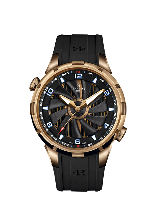 Корпус из матовой нержавеющей стали марки «316L» с PVD-покрытием бронзового цвета; неподвижный безель с декоративными каннелюрами и четырьмя зажимами. Циферблат с бронзово-чёрным полосатым узором, центральными люминесцентными стрелками часов и минут, центральной секундной стрелкой с красно-белым наконечником, люминесцентными арабскими цифрами и часовыми условными индексами; вращающийся чёрный фланец со шкалой «Роза ветров», декоративная чёрная турбина с одиннадцатью лопастями поверх циферблата. Чёрный каучуковый ремешок с логотипом Perrelet, оснащённый классической застёжкой из нержавеющей стали с PVD-покрытием цвета бронзы.