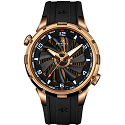 Корпус из матовой нержавеющей стали марки «316L»; неподвижный безель с декоративными каннелюрами и четырьмя зажимами. Циферблат с чёрно-серым полосатым узором, центральными люминесцентными стрелками часов и минут, центральной секундной стрелкой с красно-белым наконечником, люминесцентными арабскими цифрами и часовыми условными индексами; вращающийся чёрный фланец со шкалой «Роза ветров», декоративная чёрная турбина с одиннадцатью лопастями поверх циферблата. Чёрный каучуковый ремешок с логотипом Perrelet, оснащённый классической застёжкой из нержавеющей стали.