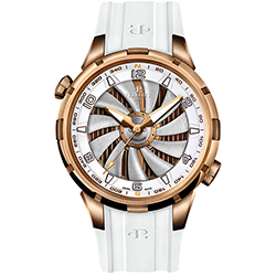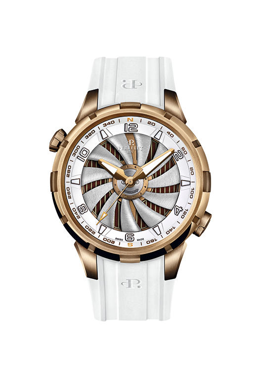 Корпус из матовой нержавеющей стали марки «316L» с PVD-покрытием бронзового цвета; неподвижный безель с декоративными каннелюрами и четырьмя зажимами. Циферблат с бронзово-коричневым полосатым узором, центральными люминесцентными стрелками часов и минут, центральной секундной стрелкой с белым наконечником, люминесцентными арабскими цифрами и часовыми условными индексами; вращающийся белый фланец со шкалой «Роза ветров», декоративная серебристая турбина с одиннадцатью лопастями поверх циферблата. Белый каучуковый ремешок с логотипом Perrelet, оснащённый классической застёжкой из нержавеющей стали с PVD-покрытием цвета бронзы.