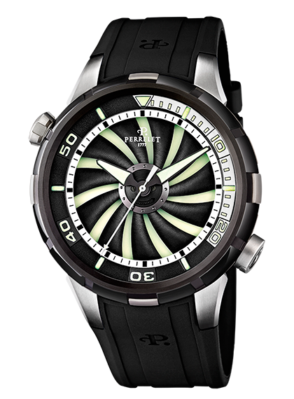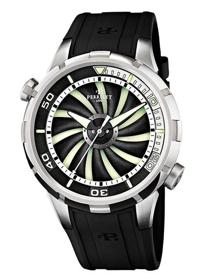 Корпус из матовой нержавеющей стали марки «316L»; неподвижный безель с декоративными каннелюрами и четырьмя зажимами. Циферблат с люминесцентным покрытием, центральными белыми люминесцентными стрелками часов, минут и секунд, белой шкалой с чёрными часовыми условными индексами; вращающийся фланец с черно-белой 60-минутной дайверской шкалой, декоративная чёрная турбина с одиннадцатью лопастями поверх циферблата. Чёрный каучуковый ремешок с логотипом Perrelet и классической застёжкой из нержавеющей стали.
