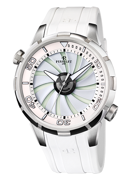 Корпус из матовой нержавеющей стали марки «316L»; неподвижный безель с декоративными каннелюрами и четырьмя зажимами. Циферблат с люминесцентным покрытием, центральными белыми люминесцентными стрелками часов, минут и секунд, белой шкалой с чёрными часовыми условными индексами; вращающийся фланец с белой 60-минутной дайверской шкалой, декоративная белая турбина с одиннадцатью лопастями поверх циферблата. Белый каучуковый ремешок с логотипом Perrelet и классической застёжкой из нержавеющей стали.