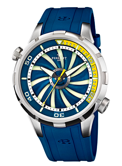 Корпус из матовой нержавеющей стали марки «316L»; неподвижный безель с декоративными каннелюрами и четырьмя зажимами. Циферблат с люминесцентным покрытием, центральными белыми люминесцентными стрелками часов и минут, центральной секундной стрелкой жёлтого цвета, белой шкалой с чёрными часовыми условными индексами; вращающийся фланец с сине-жёлтой 60-минутной дайверской шкалой, декоративная синяя турбина с одиннадцатью лопастями поверх циферблата. Синий каучуковый ремешок с логотипом Perrelet и классической застёжкой из нержавеющей стали.