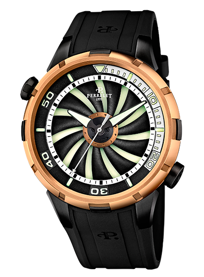 Корпус из матовой нержавеющей стали марки «316L» с чёрным PVD-покрытием; неподвижный безель с PVD-покрытием бронзового цвета, декоративными каннелюрами и четырьмя зажимами. Циферблат с люминесцентным покрытием, центральными белыми люминесцентными стрелками часов, минут и секунд, белой шкалой с чёрными часовыми условными индексами; вращающийся фланец с черно-белой 60-минутной дайверской шкалой, декоративная чёрная турбина с одиннадцатью лопастями поверх циферблата. Чёрный каучуковый ремешок с логотипом Perrelet и с классической застёжкой из нержавеющей стали с PVD-покрытием чёрного цвета.