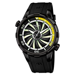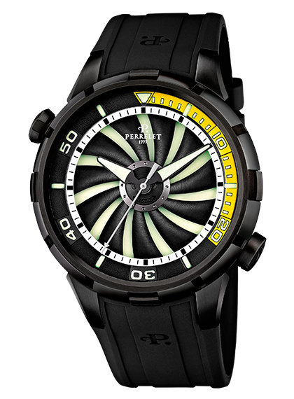 Корпус из матовой нержавеющей стали марки «316L»; неподвижный безель с чёрным PVD-покрытием, декоративными каннелюрами и четырьмя зажимами. Циферблат с люминесцентным покрытием, центральными белыми люминесцентными стрелками часов и минут, центральной секундной стрелкой жёлтого цвета, белой шкалой с чёрными часовыми условными индексами; вращающийся фланец с черно-жёлтой 60-минутной дайверской шкалой, декоративная чёрная турбина с одиннадцатью лопастями поверх циферблата. Чёрный каучуковый ремешок с логотипом Perrelet и классической застёжкой из нержавеющей стали с PVD-покрытием чёрного цвета.