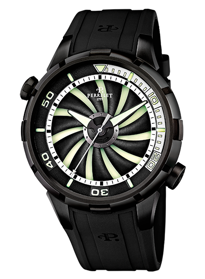 Корпус из матовой нержавеющей стали марки «316L» с чёрным PVD-покрытием; неподвижный безель с PVD-покрытием чёрного цвета, декоративными каннелюрами и четырьмя зажимами. Циферблат с люминесцентным покрытием, центральными белыми люминесцентными стрелками часов, минут и секунд, белой шкалой с чёрными часовыми условными индексами; вращающийся фланец с черно-белой 60-минутной дайверской шкалой, декоративная чёрная турбина с одиннадцатью лопастями поверх циферблата. Чёрный каучуковый ремешок с логотипом Perrelet и классической застёжкой из нержавеющей стали с PVD-покрытием чёрного цвета.