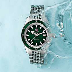 • вращающийся безель из нержавеющей стали со вставкой из полированной зеленой высокотехнологичной керамики, на которой выгравированы металлизированные цифры и метки;