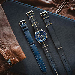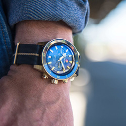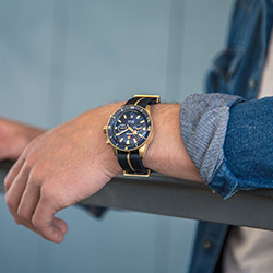 - Текстильный ремешок NATO синего цвета с линией золотистого цвета по центру, застежкой и петлями их полированной бронзы (CuAl).