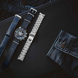 - Текстильный ремешок NATO синего цвета с застежкой из нержавеющей стали.