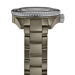 - Корпус-моноблок из матовой плазменной высокотехнологичной керамики оливкового цвета. Вращающийся безель из закаленной матовой нержавеющей стали со вставкой из матовой высокотехнологичной керамики оливково-зеленого цвета и гравированными цифрами, метками и треугольником с покрытием Super LumiNova® белого цвета.