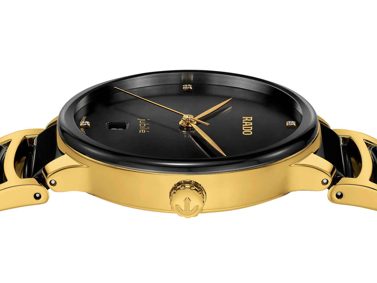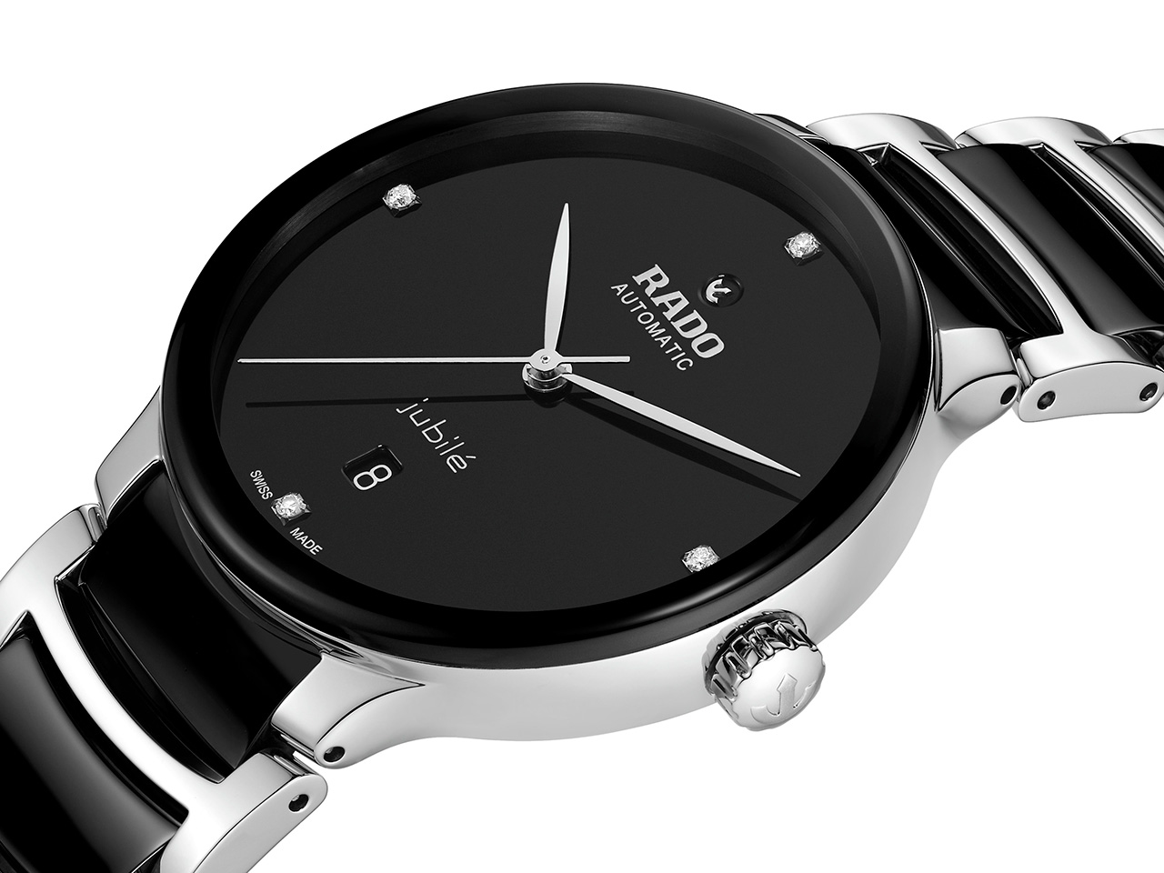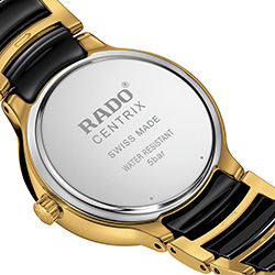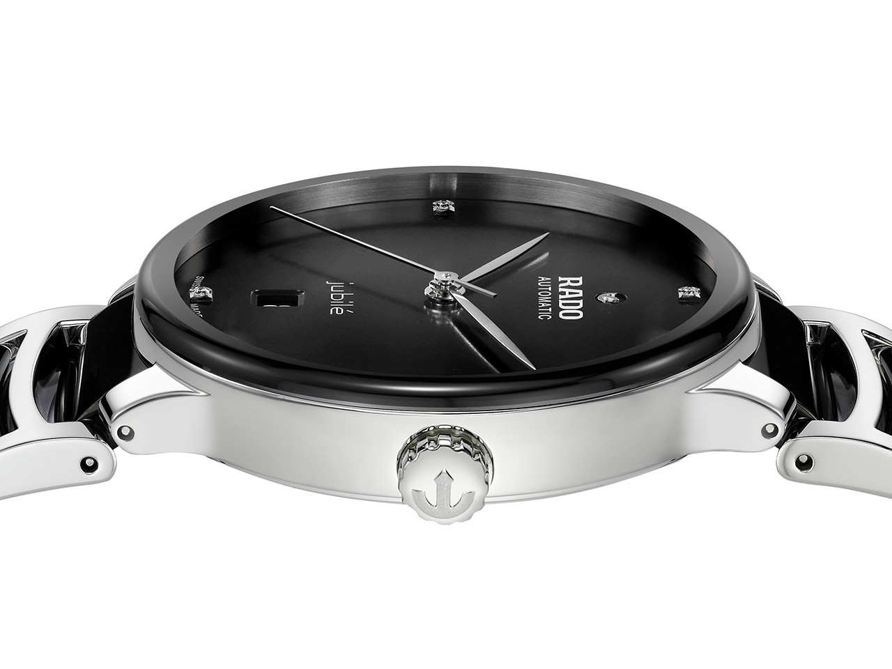 Логотип Rado в новой линейке Centrix больше, чем раньше, а надпись Jubilé возвращается на модели, в индексах которых присутствуют драгоценные камни. В маркировку крепления заводной головки была добавлена улучшенная лазером детализация, чтобы сделать ее более заметной. Вертикальные грани корпуса больше не имеют простой цилиндрической формы, а красиво закруглены, чтобы соответствовать более мягкому дизайну и плавно переходить в переработанную заднюю крышку корпуса с новой геометрией и меньшим количеством маркировок, а также выгравированным лазером серийным номером.