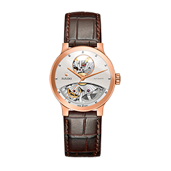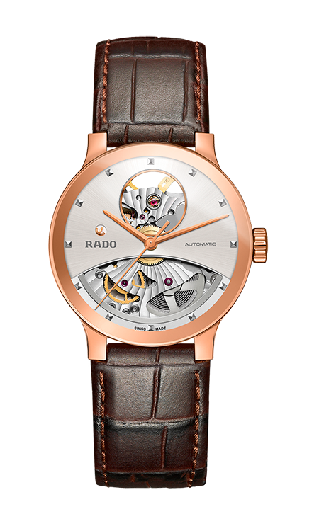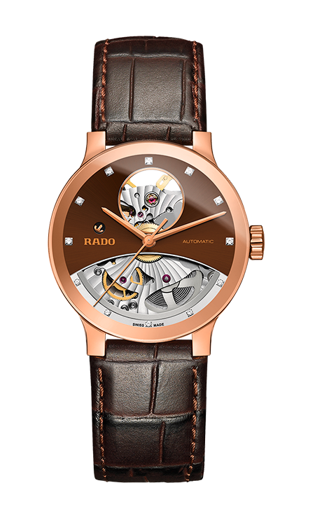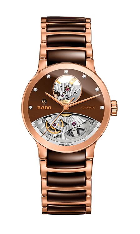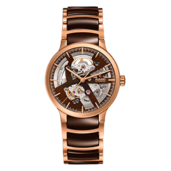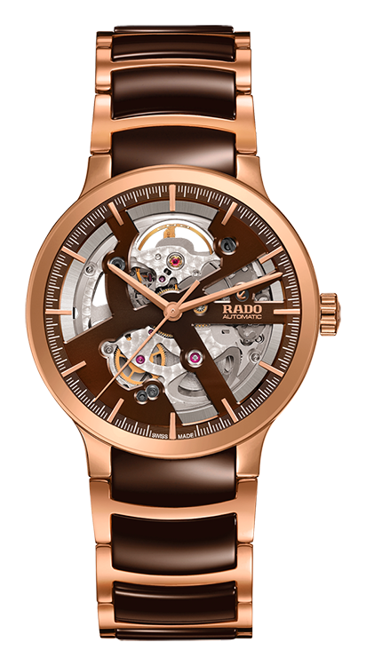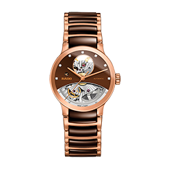 3. Rado Centrix Automatic Open Heart Gent 01.734.0181.3.031 Корпус из нержавеющей полированной стали с PVD-покрытием розовым золотом. Скелетонированный циферблат шоколадно-коричневого цвета с центральными розово-золотыми стрелками и условными накладными розово-золотыми часовыми индексами. Задняя крышка корпуса из прозрачного сапфира. Браслет с раскладывающейся застёжкой из нержавеющей полированной стали с розово-золотым PVD-покрытием и шоколадно-коричневыми полированными промежуточными звеньями из высокотехнологичной керамики. |