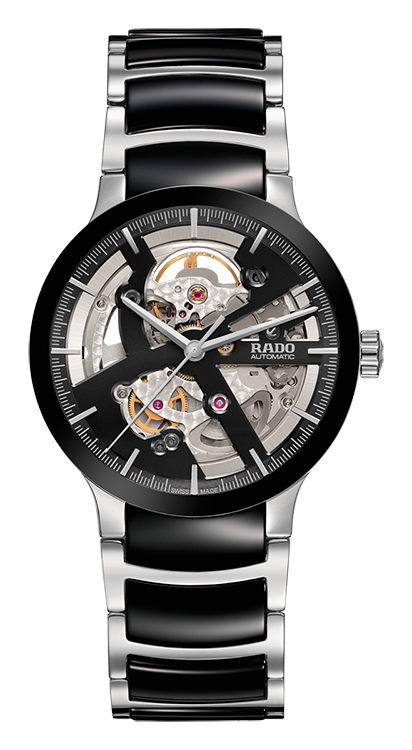 1. Rado Centrix Automatic Open Heart Gent 01.734.0178.3.015 Корпус из нержавеющей полированной стали. Безель с PVD-покрытием чёрного цвета. Чёрный скелетонированный циферблат с покрытыми родием центральными стрелками и условными накладными часовыми индексами. Задняя крышка корпуса из прозрачного сапфира. Браслет из нержавеющей полированной стали с чёрными полированными промежуточными звеньями из высокотехнологичной керамики и раскладывающейся титановой застёжкой. |
