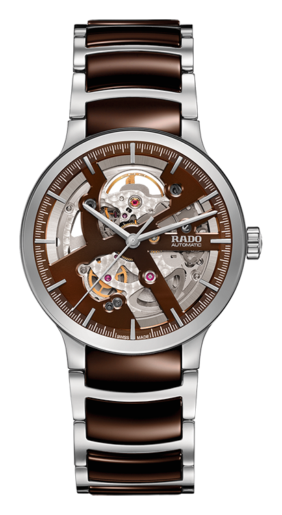 4. Rado Centrix Automatic Open Heart Gent 01.734.0179.3.030 Корпус из нержавеющей полированной стали. Скелетонированный циферблат шоколадно-коричневого цвета с покрытыми родием центральными стрелками и условными накладными часовыми индексами. Задняя крышка корпуса из прозрачного сапфира. Браслет из нержавеющей полированной стали с шоколадно-коричневыми полированными промежуточными звеньями из высокотехнологичной керамики и раскладывающейся титановой застёжкой. |
