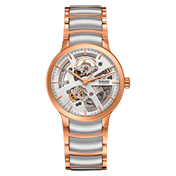 6. Rado Centrix Automatic Open Heart Gent 01.734.0181.3.010 Корпус из нержавеющей полированной стали с PVD-покрытием розовым золотом. Скелетонированный циферблат серебристого цвета с центральными розово-золотыми стрелками и условными накладными розово-золотыми часовыми индексами. Задняя крышка корпуса из прозрачного сапфира. Браслет с раскладывающейся застёжкой из нержавеющей полированной стали с розово-золотым PVD-покрытием и серыми полированными промежуточными звеньями из высокотехнологичной керамики. |
