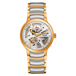 7. Rado Centrix Automatic Open Heart Gent 01.734.0180.3.011 Корпус из нержавеющей полированной стали с PVD-покрытием жёлтым золотом. Скелетонированный циферблат серебристого цвета с центральными жёлто-золотыми стрелками и условными накладными жёлто-золотыми часовыми индексами. Задняя крышка корпуса из прозрачного сапфира. Браслет с раскладывающейся застёжкой из нержавеющей полированной стали с жёлто-золотым PVD-покрытием и серыми полированными промежуточными звеньями из высокотехнологичной керамики. |