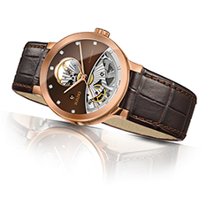 Корпус из нержавеющей полированной стали с PVD-покрытием розовым золотом. Скелетонированный циферблат шоколадно-коричневого цвета с центральными розово-золотыми стрелками и условными часовыми бриллиантовыми индексами: