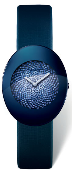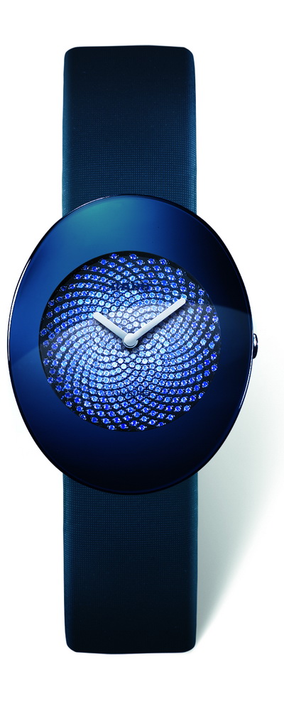 Круглый циферблат часов представляет собой настоящее украшение из сапфиров различных оттенков синего цвета, выложенных в форме "спирали Фибоначчи". Такой рисунок не только привносит визуальный баланс между эллипсом и кругом, но и является символом вечной вселенской гармонии. Сверкающий циферблат не имеет ничего лишнего, только прямые центральные серебристые стрелки оттеняют его сверкающую геометрию. Отсчитывая время, они невозмутимо перемещаются по кругу под выпуклым сапфировым стеклом синего цвета с металлическим отблеском.