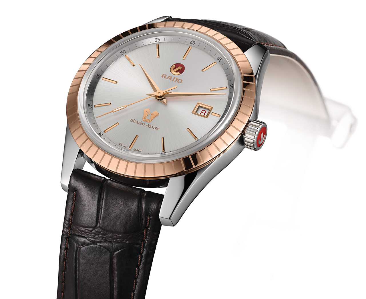 - Логотипы Rado и Golden Horse цвета розового золота.