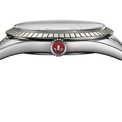 - Заводная головка из полированной нержавеющей стали с нанесенной лаком красного цвета точкой и изображением якоря цвета родия.