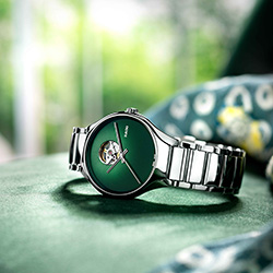 Изумрудный оттенок зеленого циферблата гармонично дополняет теплый металлический блеск инновационной плазменной керамики, которая отличается легкостью и устойчивостью к появлению царапин. Часы оснащены сапфировым стеклом с антибликовым покрытием.\