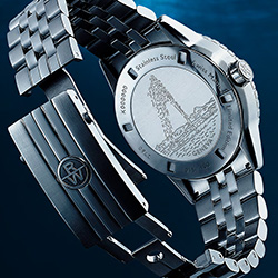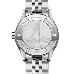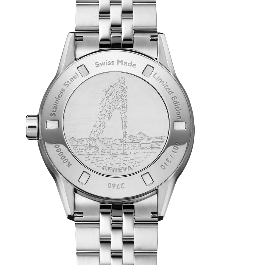 Корпус часов оснащен завинчивающейся задней крышкой, на которой выгравировано изображение Фонтана Же-д’О, знаменитой женевской достопримечательности. Часы представлены на пятирядном браслете из нержавеющей стали и оснащены раскладывающейся застежкой с двойной системой безопасности.