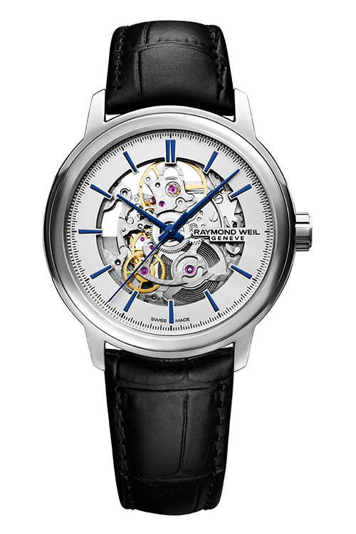 В модели Skeleton нет ничего лишнего — только самые необходимые атрибуты времени. Корпус новых часов Maestro от RAYMOND WEIL изготовлен из нержавеющей стали, его диаметр составляет 39,5 мм. Циферблат дополнен часовой, минутной и центральной секундной стрелками, которые изготовлены из стали синего цвета. Глядя на них, создается впечатление, будто они парят над пространством часового механизма.