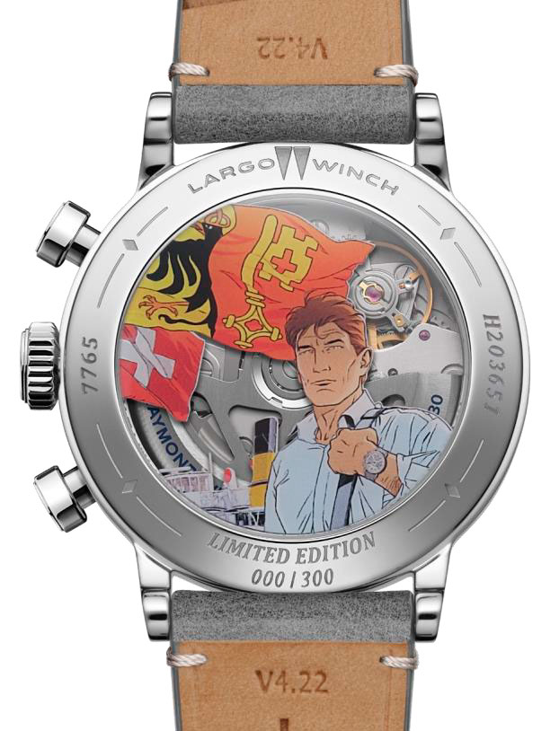- Задняя крышка: Открытая, с сапфировым стеклом и уникальным изображением Ларго Винча на мосту Монблан.
