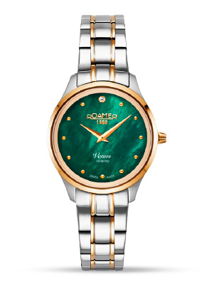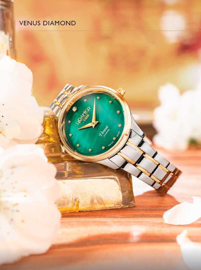 С новым Venus Diamond, Roamer вновь выбрал сочетание чистых линий и превосходных материалов, создавая часы с тщательной ручной работой и изысканной отделкой. Эта притягивающая взгляды модель имеет мерцающий циферблат из белого перламутра, украшенный бриллиантом в положении 12 часов и дополненный 11 утонченными круглыми индексами.