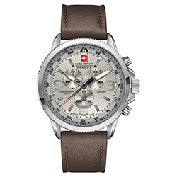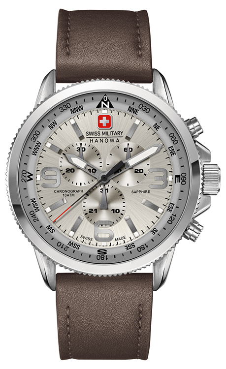 6. Swiss Military Hanowa Arrow Chrono 06-4224.04.030: серебристый корпус, серебристый циферблат, тёмно-коричневый ремешок.
