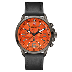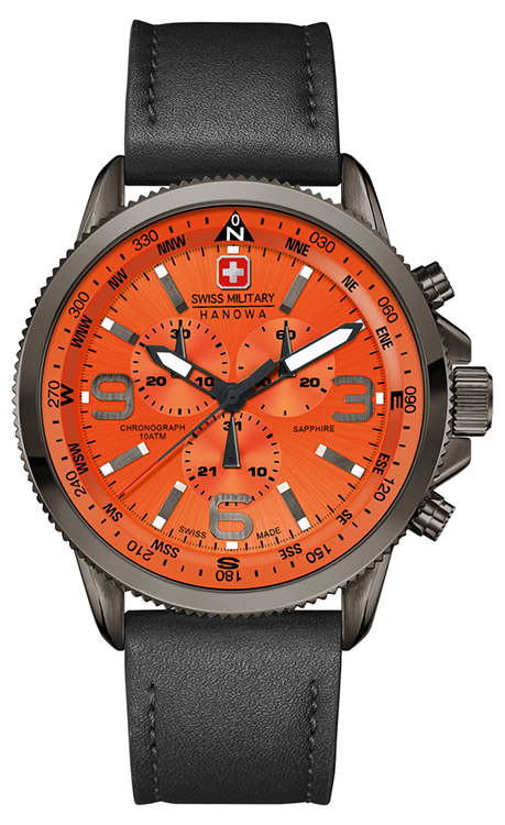 5. Swiss Military Hanowa Arrow Chrono 06-4224.30.079: корпус с ионным напылением цвета оружейной стали, оранжевый циферблат и чёрный ремешок.