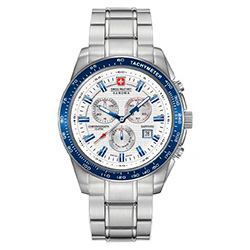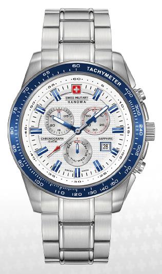| 6. Swiss Military Hanowa Crusader Chrono 6-5225.04.001.03: корпус из нержавеющей стали 316L, безель с ионным покрытием синего цвета и тахиметрической шкалой, белый циферблат с часовыми индексами синего цвета, браслет из нержавеющей стали. | |