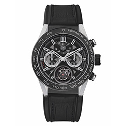 | 1. TAG Heuer Carrera Heuer-02T Tourbillon Titanium CAR5A8Y. FC6377: титановый корпус с чёрным покрытием из карбида титана, проушины – с матовой отделкой, чёрный керамический безель с серой тахиметрической шкалой; чёрный циферблат с условными часовыми индексами, стрелками и счётчиками хронографа из титана с матовой отделкой, с красной надписью «COSC» между отметками «8 и 9 часов»; чёрный кожаный ремешок, титановая раскладывающаяся застёжка с чёрным покрытием из карбида титана, предохранительными кнопками и символом марки «TAG Heuer». | |