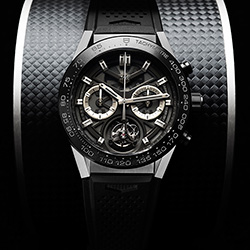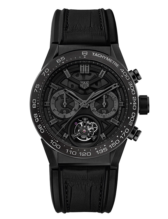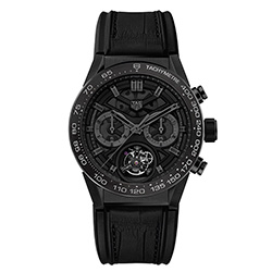 | 2. TAG Heuer Carrera Heuer-02T Tourbillon «Black Phantom» Limited edition CAR5A8Z. FC6377: модель «all black» ограниченной серии в количестве 250 индивидуально пронумерованных экземпляров: титановый корпус с чёрным покрытием из карбида титана всех его металлических элементов, чёрный керамический безель с серой тахиметрической шкалой; чёрный циферблат с условными часовыми индексами, стрелками и счётчиками хронографа из титана чёрного цвета, с серой надписью «COSC» между отметками «8 и 9 часов»; чёрный кожаный ремешок, титановая раскладывающаяся застёжка с чёрным покрытием из карбида титана, предохранительными кнопками и символом марки «TAG Heuer». | |