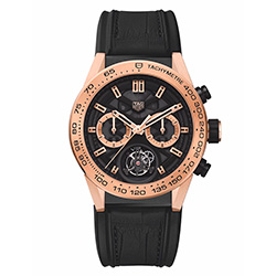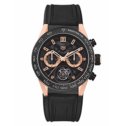 | 4. TAG Heuer Carrera Heuer-02Т Tourbillon Titanium and Rose Gold/ Gold Bezel CAR5A5Z. FC6377: титановый корпус с чёрным покрытием из карбида титана, кроме проушин для ремешка из 18 каратного розового золота, безель из розового золота (18 карат) с чёрной тахиметрической шкалой; чёрный циферблат с условными часовыми индексами, стрелками и счётчиками хронографа из титана с гальваническим покрытием из 18-каратного розового золота, с тёмно-серой надписью «COSC» между отметками «8 и 9 часов»; чёрный кожаный ремешок, титановая раскладывающаяся застёжка с чёрным покрытием из карбида титана, предохранительными кнопками и символом марки «TAG Heuer». |