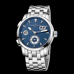 9. Модель Dual Time Manufacture 3343-126LE-7/93 лимитированная серия 1846 экземпляров: корпус из нержавеющей стали, синий циферблат, браслет из нержавеющей стали.