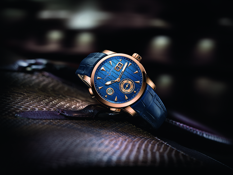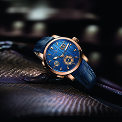 3. Модель Dual Time Manufacture 3346-126LE/93 лимитированная серия 500 экземпляров: корпус из 18-каратного розового золота, синий циферблат, синий ремешок из кожи аллигатора.