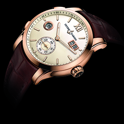 1. Модель Dual Time Manufacture 3346-126/90: корпус из 18-каратного розового золота, циферблат «Eggshell», ремешок из кожи аллигатора коричневого цвета.
