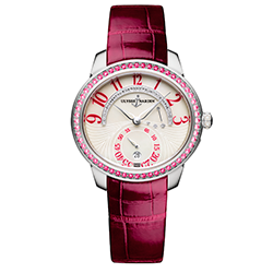 | 1. Ulysse Nardin Jade Jewellery White Gold 3100-125B/591.6: корпус из 18-каратного белого полированного золота, безель с рубинами круглой огранки; белый перламутровый циферблат с бриллиантовой инкрустацией общим весом 0,332 карата; ремешок из кожи аллигатора рубинового (тёмно-малинового) цвета с раскладывающейся застёжкой из 18-каратного белого полированного золота. | |